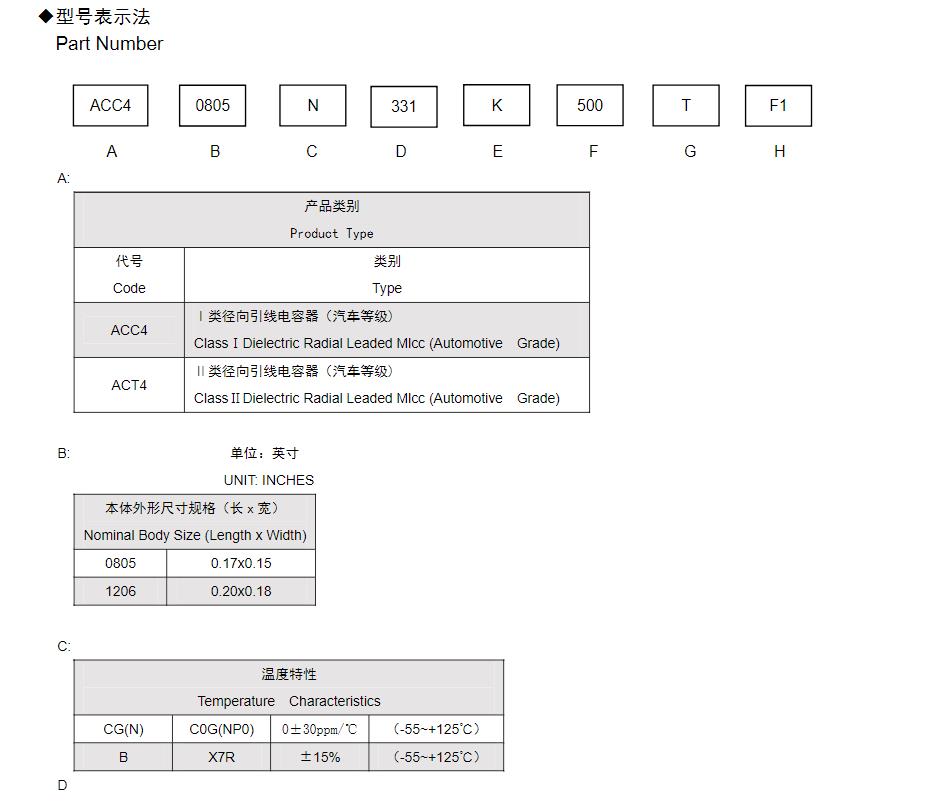 風(fēng)華高科車規(guī)徑向引線多層陶瓷電容器型號(hào)命名規(guī)則: