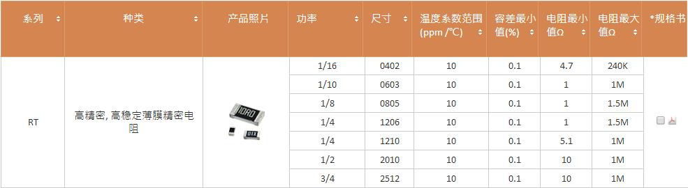 YAGEO國巨薄膜精密電阻-RT系列,采用先進的濺射技術,國巨薄膜芯片電阻提供高精密度,高穩定性,±0.1%的窄公差和±25ppm/℃的低TCR。最小的尺寸為0201,最低TCR為±5ppm/℃。