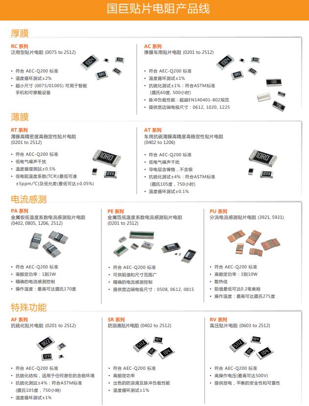國巨是全球最大的貼片電阻供應商之一,在汽車、工業(yè)、替代能源和消費電子等主要市場鄰域提供各種應用。國巨提供完整貼片電阻產品系列,涵蓋汽車級金屬電流測電阻、精密薄膜電阻、厚膜防浪涌電阻、抗硫電阻、高功率電阻、高電壓電阻、排阻、小型010050075等,全方位解決方案。