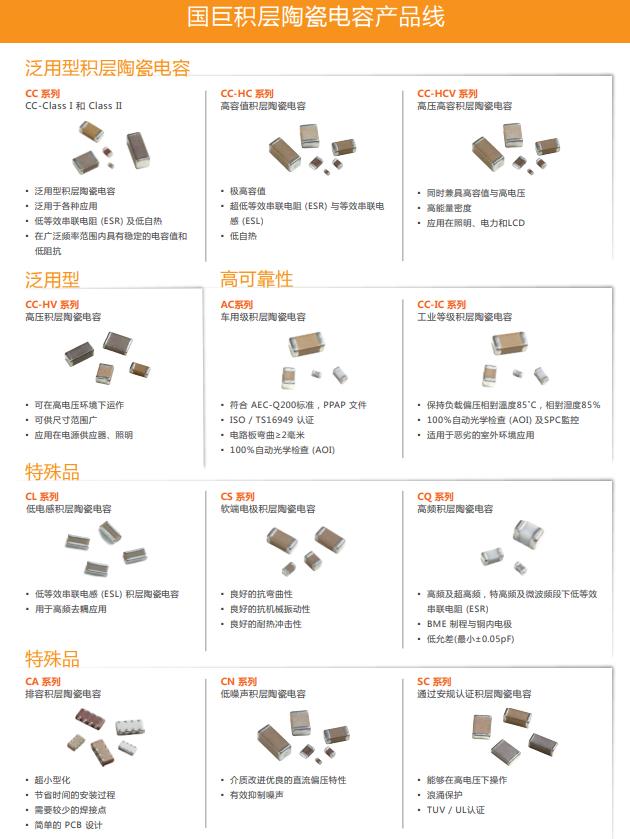 YAGEO國巨多層陶瓷電容器主要包括:普通陶瓷電容器,高值陶瓷電容器,串聯電容器,高壓電容器,中壓電容器,高頻電容器,微波電容器,低電感電容器,X2Y®電容器濾波器,陶瓷層電涌保護器等。