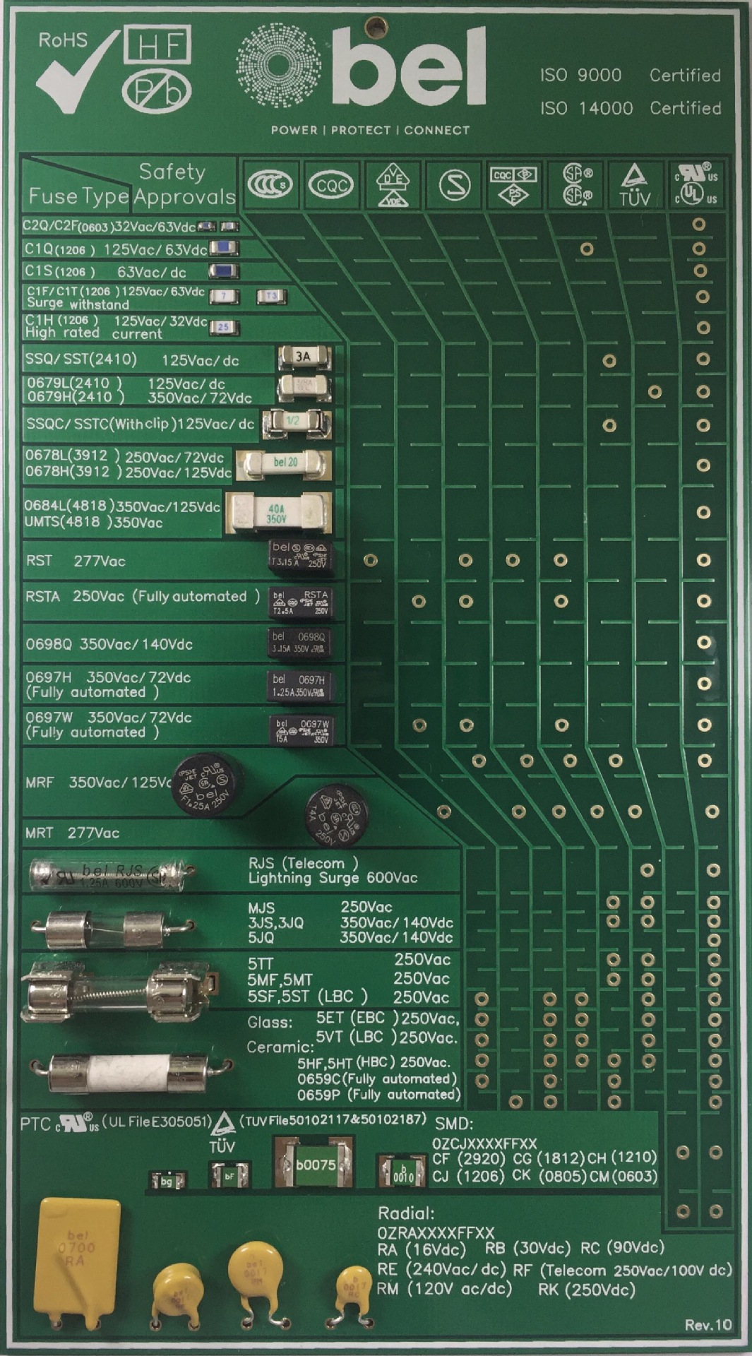 Bel Fuse-Circuit Protection 提供廣泛的 PCB 安裝、表面貼裝和 PTC 自恢復保險絲。PCB 安裝產品包括徑向、標準玻璃和陶瓷管狀保險絲。該公司已經走在行業向表面貼裝保險絲設計(諸如磚式和片式保險絲)轉型升級的前沿,解決了人們對小而緊湊的技術的需求。Bel Fuse-Circuit Protection 還提供完整的 PTC 自恢復保險絲產品線,同時具有表面貼裝和徑向封裝選擇。這些保險絲產品有許多第三方機構按照各種各樣的性能標準進行了認證。認證標志授權機構如 UL、CSA、PSE、CCC、VDE 和 Semko。這些保險絲和 PTC 自恢復產品全部符合 RoHS 2 規范