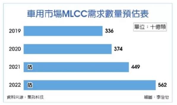 盡管消費性產品需求轉弱,但自第三季起至今,汽車市場維持強勁的需求,成為供應商在新產品規劃與產能擴增的重點方向。預估2021、2022年車用MLCC需求將上看4,490億顆、5,620億顆,年增率將達20%、25%。