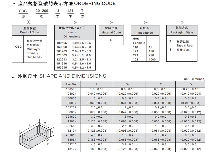 1、CBG產品代號:疊層片式通用型磁珠2、201209表示規格尺寸:100505 1.0 0.5 0.5 160808 1.6 0.8 0.8 201209 2.0 1.2 0.9 321609 3.2 1.6 0.9 322513 3.2 2.5 1.3 451616 4.5 1.6 1.6 453215 4.5 3.2 1.5