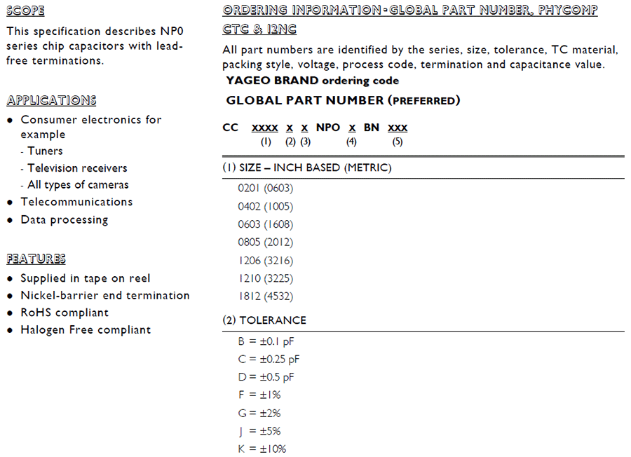 電容公差:B =± 0.1pF;C =± 0.25pF;D =±0.5pF; F =±1%;G =± 2%;J =±5%;K =±10%