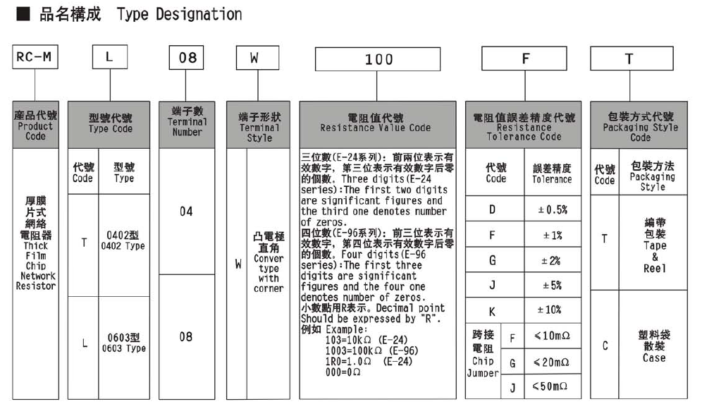 電阻公差:D:±0.5%;J:±5.0%;K:±10%;M:±20%