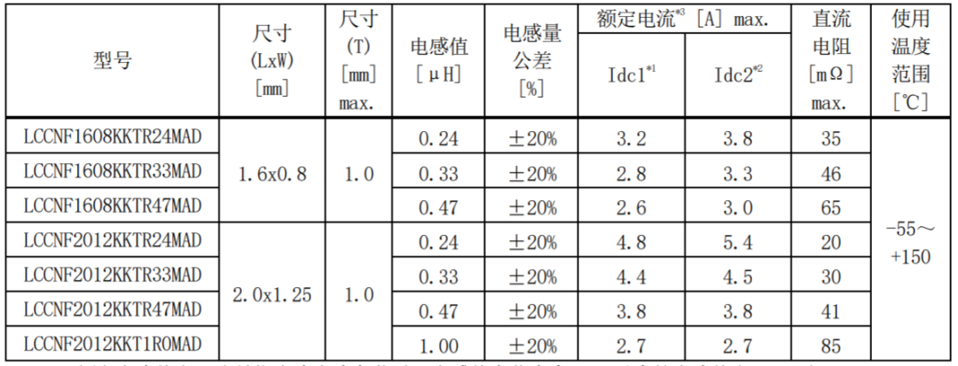 *3 額定電流值為能夠滿足直流重疊允許電流和溫度上升允許電流的直流電流值 * 需要根據周圍溫度進行額定電流的降額。