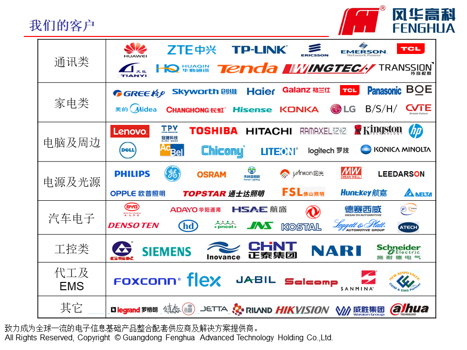 風華高科具有完整與成熟的產品鏈,具備為通訊類、消費類、計算機類、汽車電子類、照明電器類等電子整機整合配套供貨的大規模生產能力。