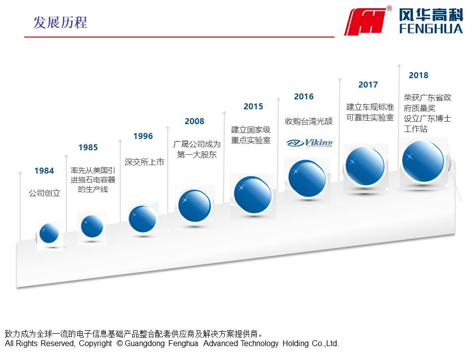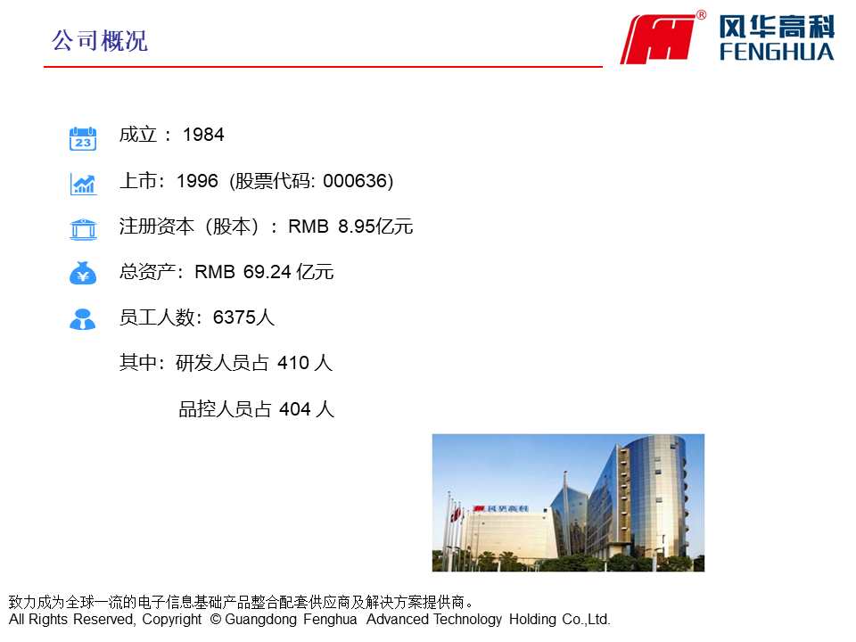 廣東風華高新科技股份有限公司(證券簡稱風華高科,證券代碼000636)成立于1984年,是一家專業從事高端新型元器件、電子材料、電子專用設備等電子信息基礎產品的高新技術企業,1996年在深圳證券交易所掛牌上市。風華高科自進入電子元器件行業以來,實現了跨越式的發展,現已成為國內最大的新型元器件及電子信息基礎產品科研、生產和出口基地,擁有自主知識產權及核心產品關鍵技術的國際知名新型電子元器件行業大公司。