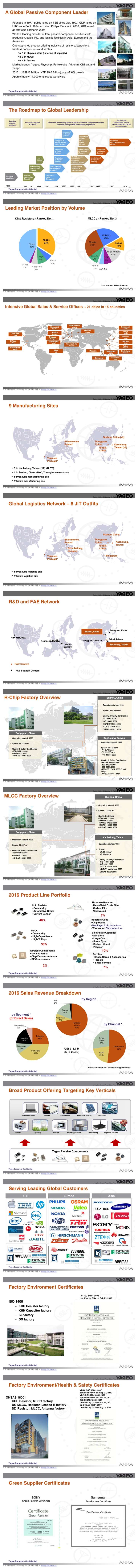 國巨現(xiàn)今為全球第一大芯片電阻器 (R-chip) 制造商、全球第三大積層陶瓷電容 (MLCC) 供貨商,在磁性材料 (ferrits) 領域則名列全球第三。國巨目前在全球18個國家有27個行銷/服務據(jù)點、8座生產(chǎn)基地、5座 JIT即時發(fā)貨中心,及3個研發(fā)中心。位于歐洲的飛磁(Ferroxcube) 和 Vitrohm 也隸屬于國巨集團,分別以生產(chǎn)磁性材料和傳統(tǒng)電阻為主。