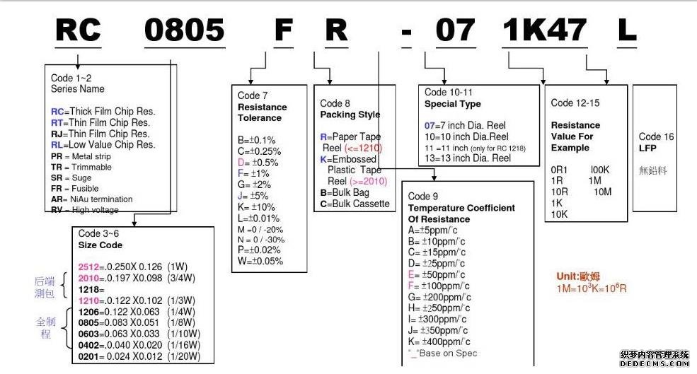 例如:國巨貼片電阻型號:0805 F R 07 1K47 L