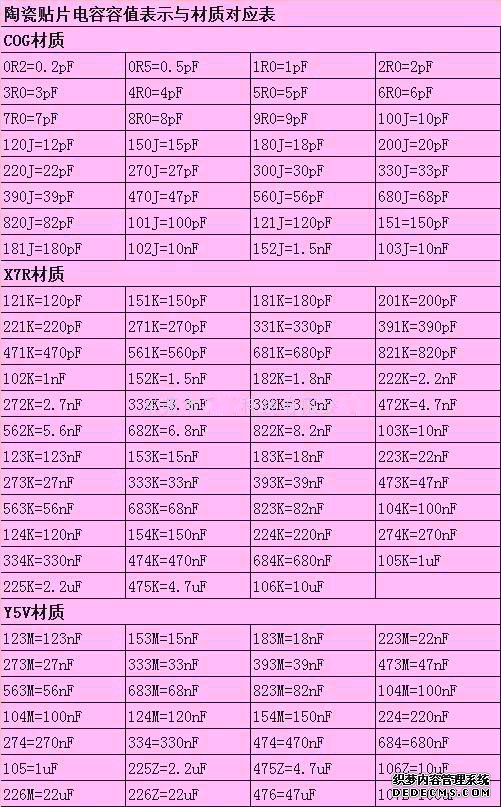 陶瓷貼片電容容值對照表